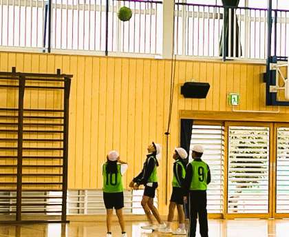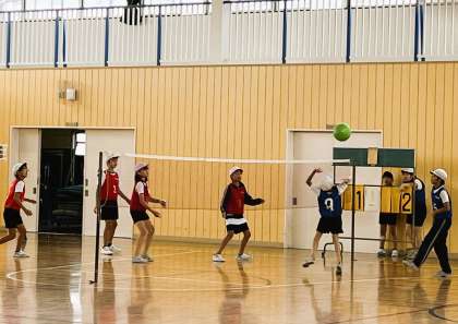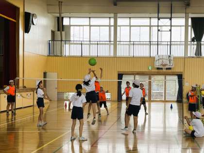 5年生の体育の授業です。ボール運動のソフトバレーボールに取り組んでいます。今日は、簡易なルールでのゲームをしています。自チームの課題は何か?を考えながらゲームをしています。頑張れ!