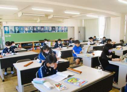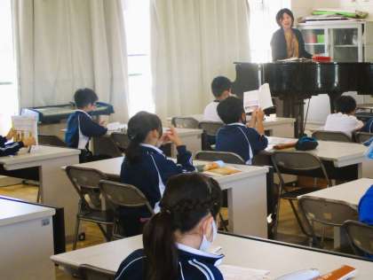 4年生の音楽の授業です。今日は「もみじ」の輪唱に取り組んでいます。上手に輪唱ができるかな?頑張れ!