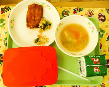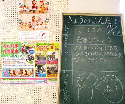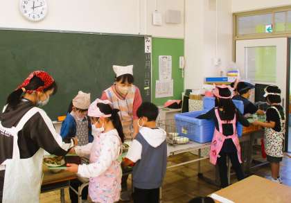 1年生の給食準備・配膳の様子です。当番の仲間たちが手際よく配膳し、運んでくれています。