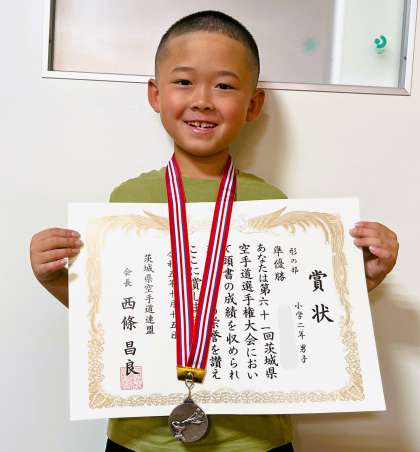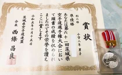 2年生の仲間が、昨日【10月15日】行われた「第六十一回茨城県空手道選手権大会」の形の部小学二年男子において、準優勝を果たしました。そして、11月中旬日行われる関東大会に出場するとのことです。本人は優勝できずに悔しそうでしたが、「ピンチはチャンス」です。この負け(ピンチ)を勝ち(チャンス)にチェンジしてほしいと思います。