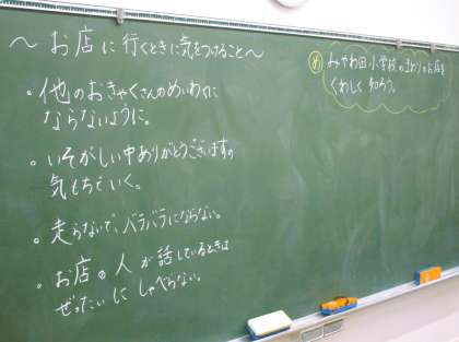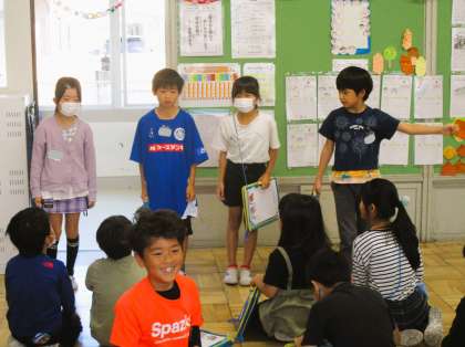 2年生の生活科の授業です。今日は、町探検に出かけます。その前に、お店の方にどのように質問するか予行練習をしています。練習することで、自信をもって質問することができますね。しっかり学んできてほしいと思います。