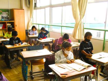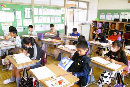 3年生の算数の授業です。割り算について学んでいます。今日は、答えが大きな数になる割り算のやり方について考えています。みんな一生懸命取り組んでいます。