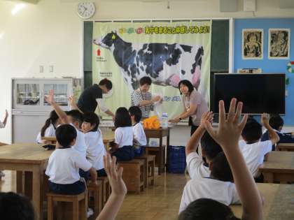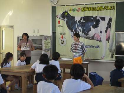 3時間は、2年生がミルク教室で牛乳の栄養について学習しました。グループごとに牛乳からバターをつくりました。
