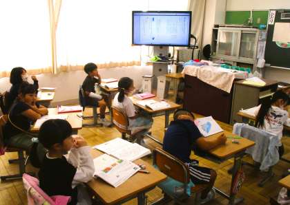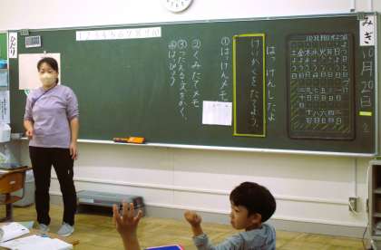 1年生の国語の授業です。「書くこと」の学びです。今日は、書くための準備として、「はっけんめも」の使い方について学んでいます。みんなどんな作文を書くのかな?楽しみですね。