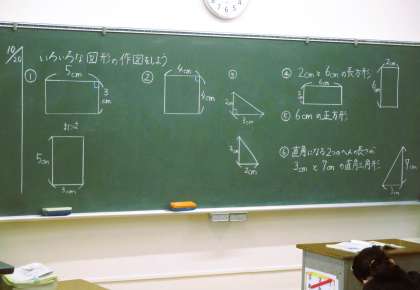 2年生の算数の授業です。図形の学びです。今日は、学んだ様々な図形を三角定規等を上手に使って作図しています。みんな丁寧に作図することができています。頑張ってます!