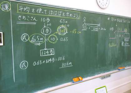 5年生の算数の授業です。数量関係の学びです。今日は、平均の求め方について、実際に自分の歩幅がどのくらいになるのか、平均値を求めています。実感を伴う学びですね。