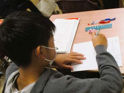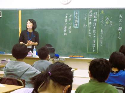 5年生の国語の授業です。古文に親しんでいます。今日は「平家物語」の音読を聴きながら、感じたことをワークシートにまとめています。