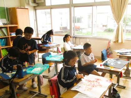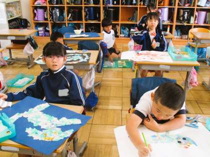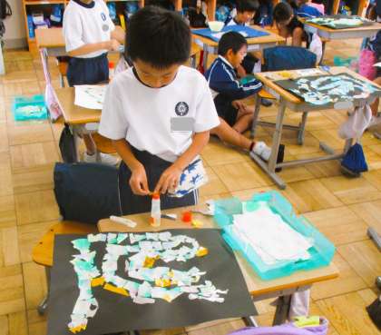 2年生の図画工作の授業です。薄い絵の具でぼやかした半紙を切り取り、思い思いの動物を切り張りしながら作製しています。みんな4一生懸命取り組んでいます。