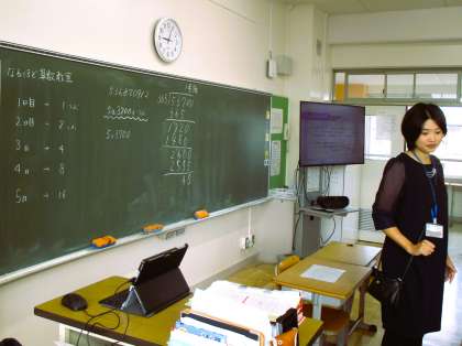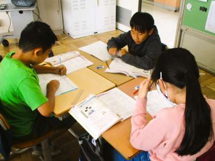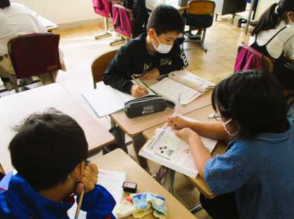 4年生の算数の授業です。今日は単元のまとめとして様々な問題をグループの仲間と教えい合いながら解いています。みんな集中しています。