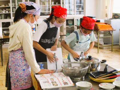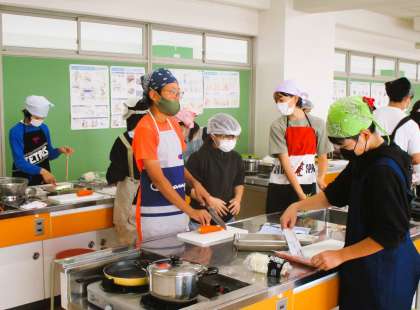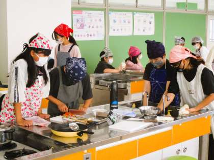 6年生、家庭科の授業の様子です。今日は、炒め物の調理実習です。野菜を切り、ベーコンを巻いてバターで炒めます。味は塩コショウで。みんな楽しみにしつつ安全に配慮しながら一生懸命取り組んでいます。いい雰囲気で実習が進んでいます。