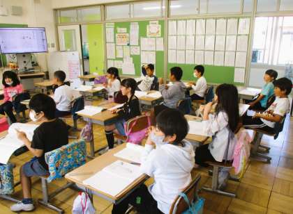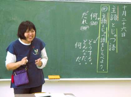 2年生の国語の授業です。今日は、主語と述語の関係性について考えています。先生は仲間たちが楽しく集中して学習できるようなワークを取り入れながら学習を進めています。みんな楽しそうに、かつ真剣に学習に取り組んでいます。