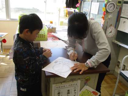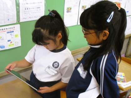 1年生の生活科の授業です。今日は、様々な球根をタブレットで写真を撮ったり、見る向きを変えてみたりして観察しています。みんな一生懸命活動しています。タブレット活用もだいぶ上手になりました。