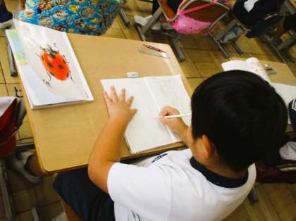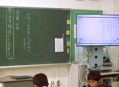 2年生の国語の授業です。「たからものしょうかいをしよう」は、「書くこと」の単元です。今日は、メモを活用して作文に取り組みます。みんな頑張れ!