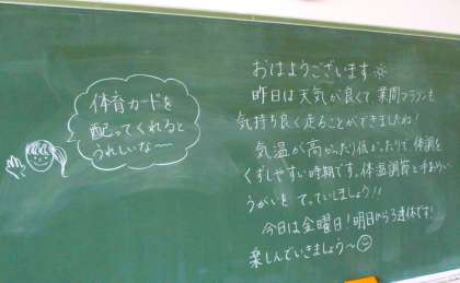 チーム宮和田では多くの担任が黒板にメッセージを書いて仲間たちを迎えてくれています。心温まるメッセージばかりです。