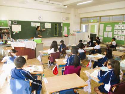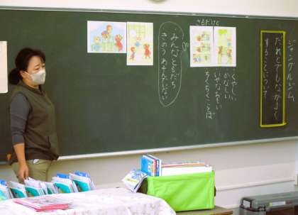 1年生の道徳の授業です。今日は「ジャングルジム」という読み物教材を活用して、「だれとでもなかよくするには?」ということを考えています。みんな一生懸命考えています。