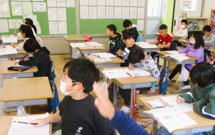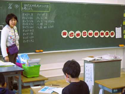 2年生の算数の授業です。今日は「八の段の九九のつくりかたを考えよう」が学習課題です。黒板にある実物模型を思考の手掛かりにして、みんな一生懸命考えています。朝から集中しています。素晴らしい!