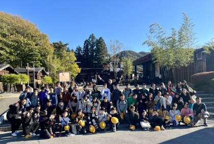 8:50 日光江戸村到着。みんなで ハイ、チーズ 最高の天気です!