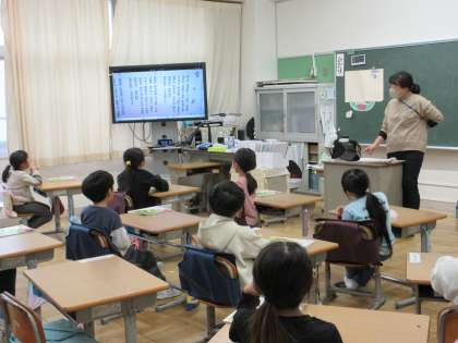 1年生の音楽の授業です。 校歌を歌う素敵な歌声が響きました。 「輝け宮和田 宮和田小学校♪」