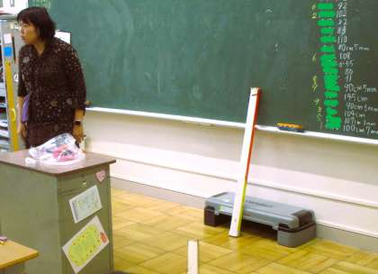 2年生の算数の授業です。長さの学びです。今日は、紙テープを自分の感覚で1m切って、実際の長さをみんなで図っています。誰が一番ニアピン賞だったかな?実感を伴う理解につながる学びです。
