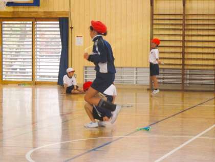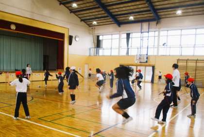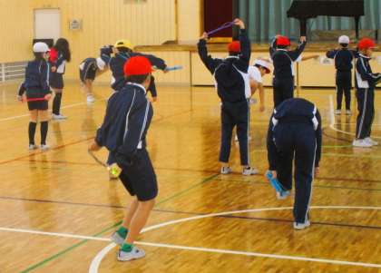 3年生の体育の授業です。合同体育です。今日は、体つくり運動の基本的な運動を組み合わせる運動のなわとびに取り組んでいます。みんな一生懸命取り組んでいます。