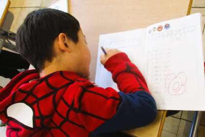 2年生の国語の授業です。「1000よりも大きな数」の単元です。今日は、100を単位として、100以上の大きな数は100のいくつ分にあるだろうかについて考えています。教え合い、学び合いながら学習を進めています。