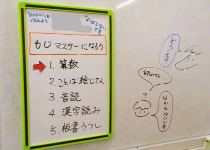 通級指導教室の算数及び自立活動の授業です。今日は、算数の学習をした後、もじマスターになろうとの課題でもじマスターになるための友達とのかかわりについて実感を伴いながら学んでいます。いい雰囲気で学習が進んでいます。