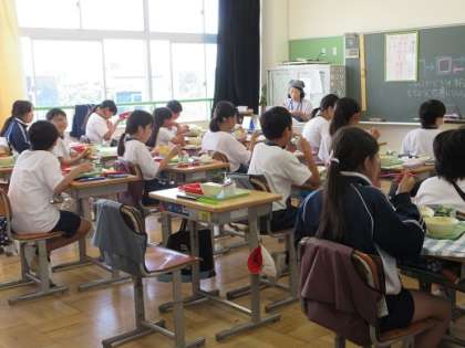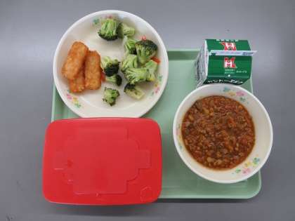 今日の給食は、ご飯、牛乳、キーマカレー、ハッシュドポテト、ブロッコリーのマリネでした。