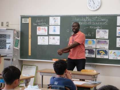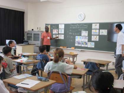 ALTの先生と担任の先生と一緒に「I play 〜」の学習をしていました。