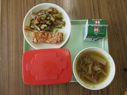 今日の給食は、ご飯、牛乳、いかの竜田揚げ、茎わかめの炒め煮、沢煮椀でした。