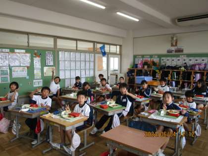 水泳学習があったので、今日は、いつもよりおなかがすいたと思います。みんなで楽しそうに食べていました。