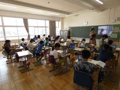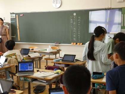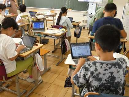 タブレットを使って、各自が調べたことを文章で書き表す学習をしています。
