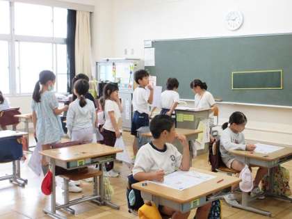 2年生の授業です。 先生にテストを見てもらったり、ドリルを見てもらったりしていました。