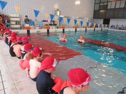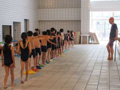 本日、1年生の2回目の水泳学習がありました。 準備運動をして、しっかりお話を聞いて始まりました。