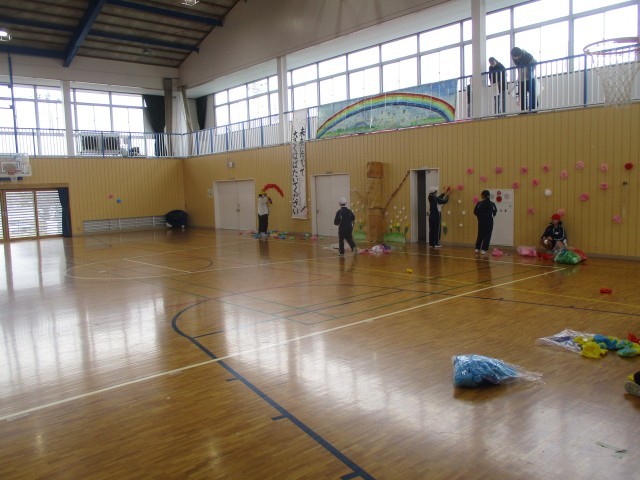 6年生を送る会準備をしました。体育館の飾りつけに協力して取り組みました。