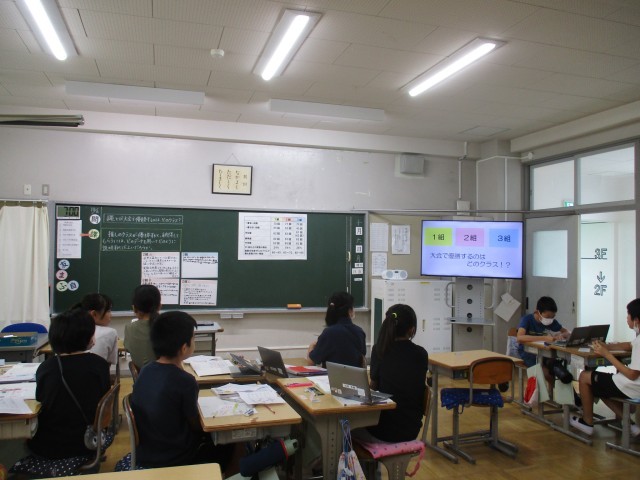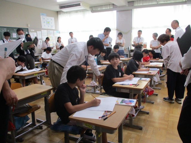 事務所や市教委の先生、市内の先生方など方たくさんのお客様をお迎えし、各クラスで授業を公開しました。