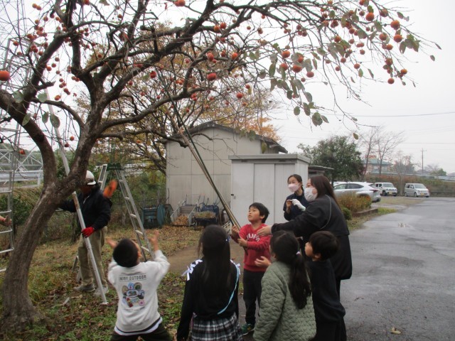 今日はトマトクラブのお友達が柿の木のお手入れに大活躍!