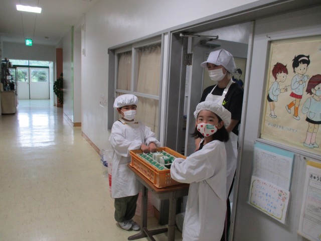 配膳室前の1枚。「3年生です。牛乳を取りに来ました。」「いつもありがとうございます!」素敵な言葉が聞こえてきました。ごくごく自然に感謝の気持ちを伝える久賀っ子です。