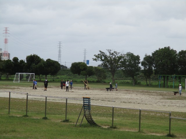 6年生が校庭の整備をしている様子です。相当な枯れ草の量でしたが、そこはマンパワー!みるみるきれいに…。また、地域の方も除草カートで1日中校庭を走り回ってくださいました。どうもありがとうございました。
