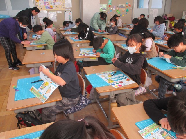 2年生が図工でカッターの使い方を学びました。KOSの皆様の心強いサポートのおかげで、けがなく、カッターと仲良くなることができました。素晴らしい集中力でした。