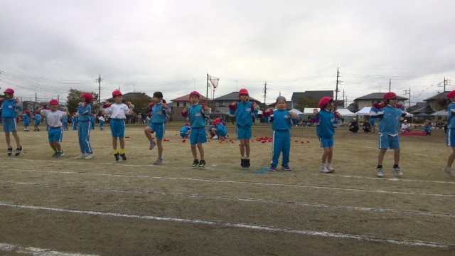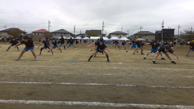 雨がやみ、運動会を行っています。1、2年チェッコリ、3、4年ソーランを行いました。