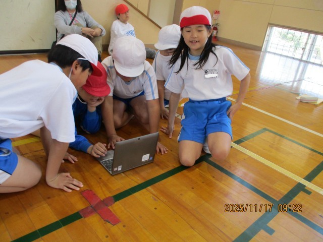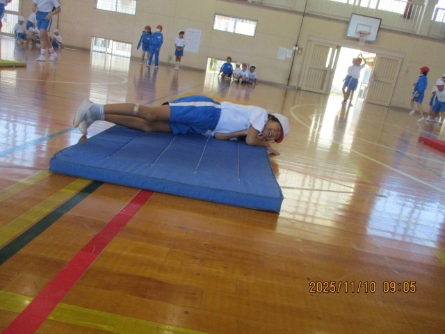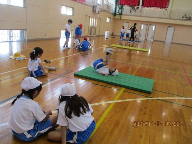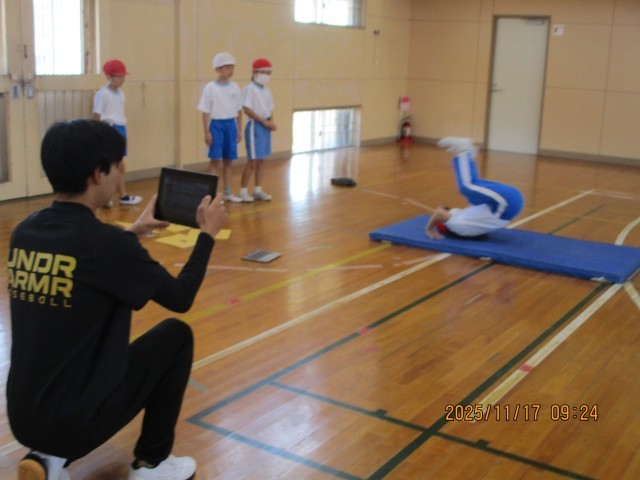 体育サポーターの先生が週に1回来てくれて一緒にマット運動の学習をしています。動画を撮って自分の回り方をもう一度見てみたり、みんなでどうすればもっと上手に回れるようになるか相談したりしています。
