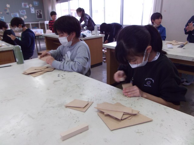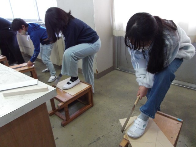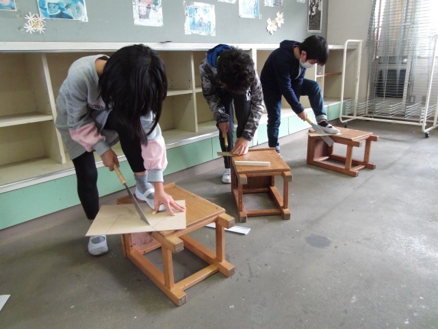 今日は、4年生の図工でのこぎりを使って木材を切る学習をしました。