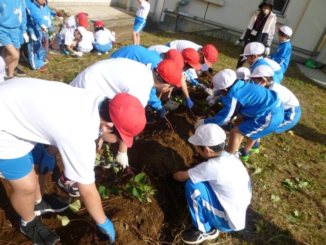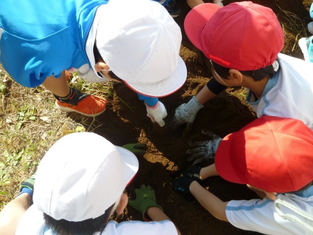 なかなか掘れない大きなおいもは協力して掘り出します。
