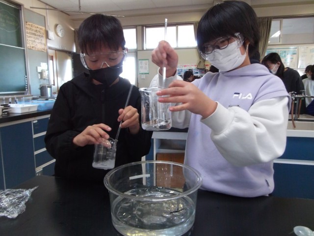 桜が丘小☆絶好調~溶けたものは取り出せる?~ 公開日 2025/12/04 更新日 2025/12/04 お知らせ 5年生は、水溶液から食塩とミョウバンを取り出す実験をしていました。冷やすことで徐々に白くなっていくようすを、熱心に観察していました。 +1