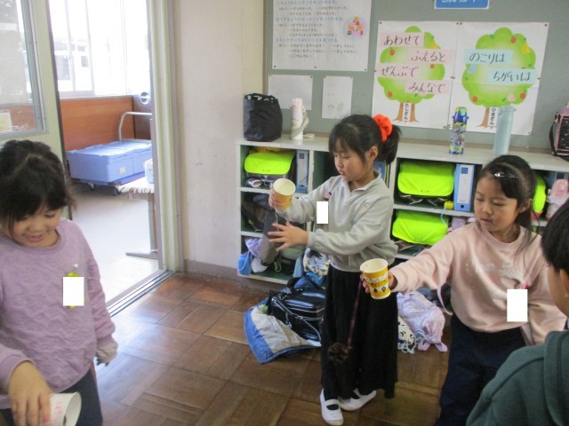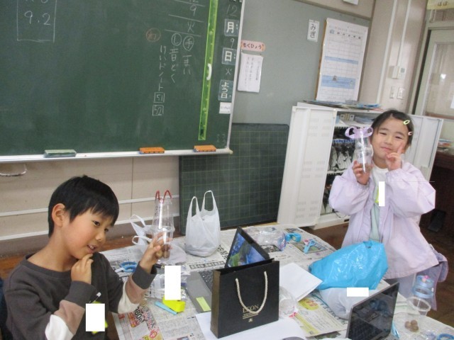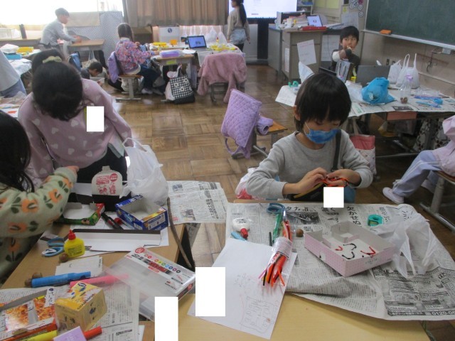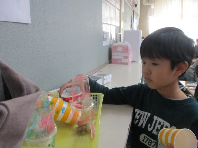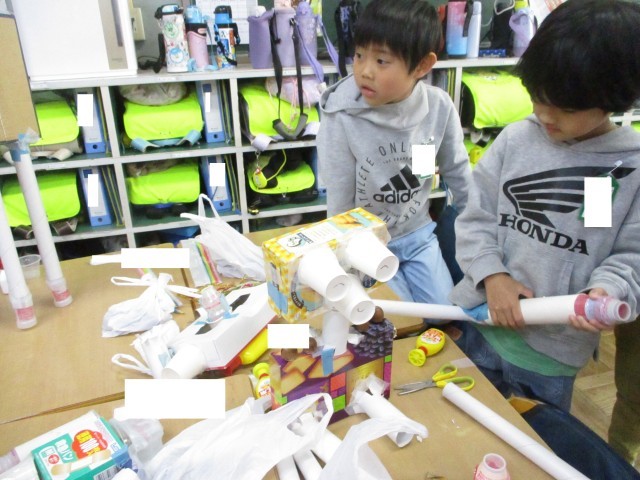 今日は、生活科で集めたどんぐりや木の実を使って、「おもちゃ作り」を行いました。