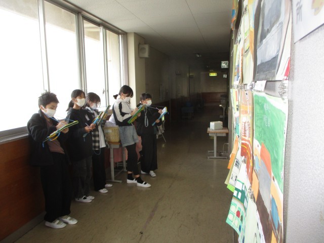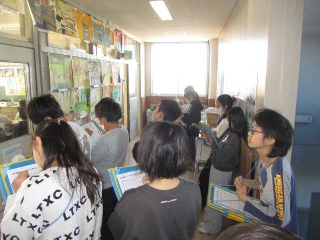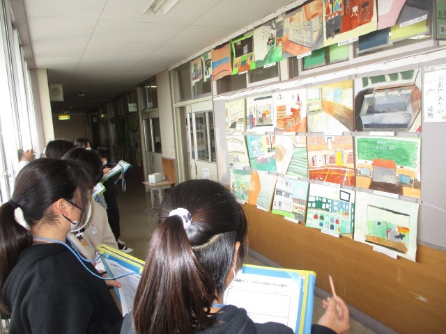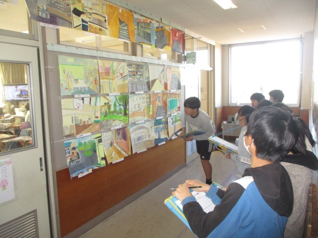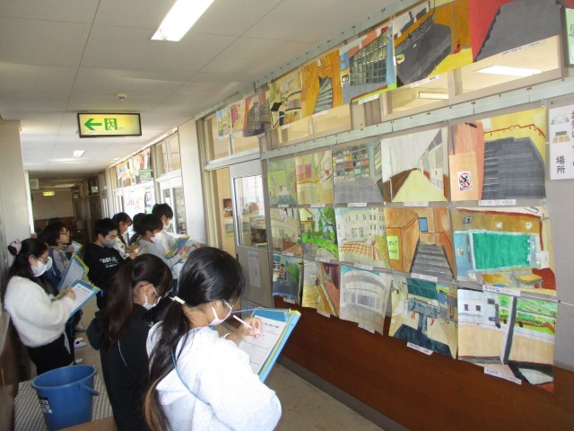 秋に図工で描いた「わたしのお気に入りの場所」の鑑賞会をしました。友達の作品の良いところ、工夫したところを見つけながら、集中して鑑賞しています。