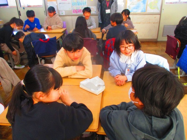 冬休み明けの集会では、真剣に話を聞き、2時間目のサイコロトークでは、お題に合わせて、冬休みの思い出を楽しそうに語り合っていました。