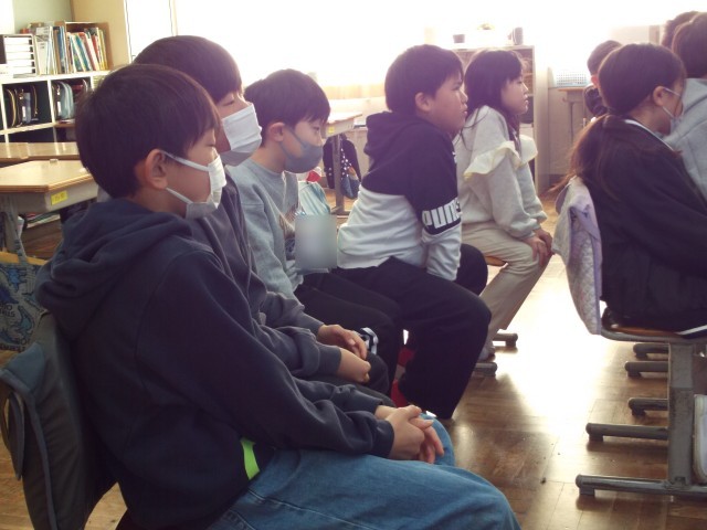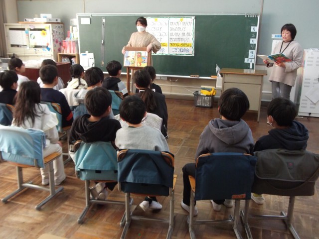 今日は3年生の学級で、こぎつねの会による読み聞かせがありました。