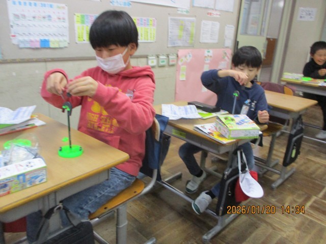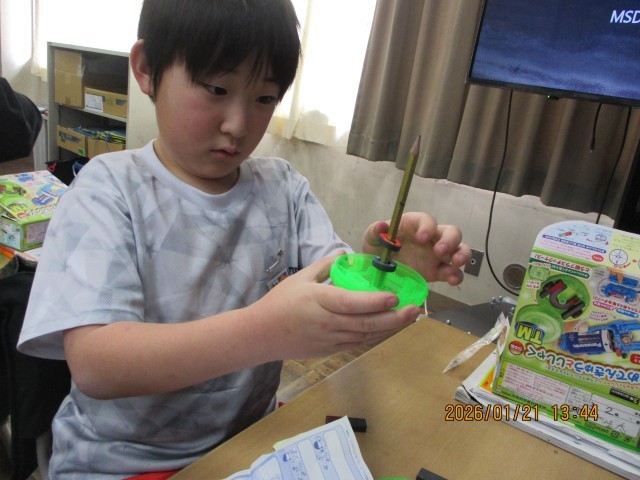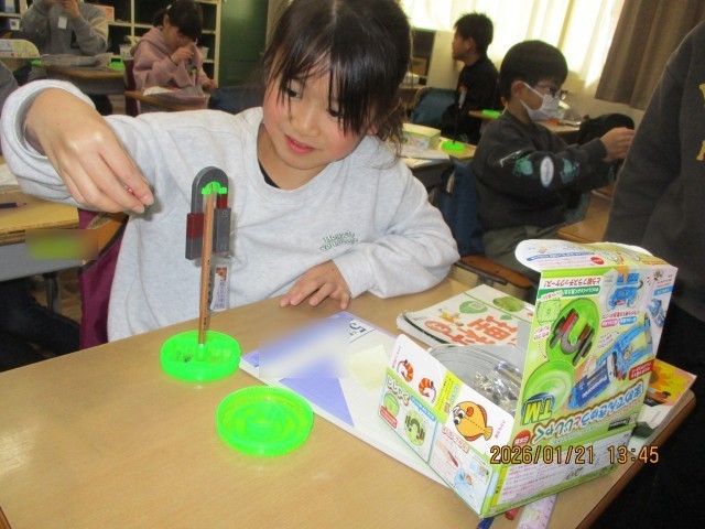 豆電球に引き続き、じしゃくを使って、いろいろな実験をしています。どんなものがじしゃくに引き寄せられるかなど、実験を手際よくこなしていきます。