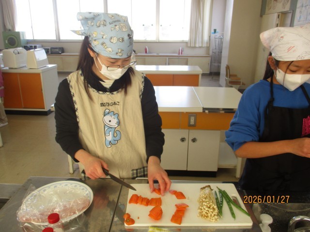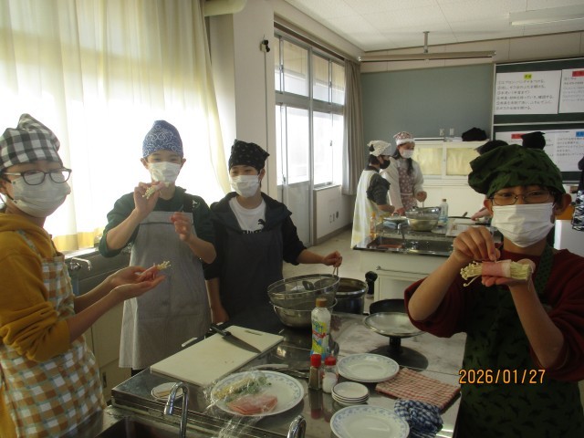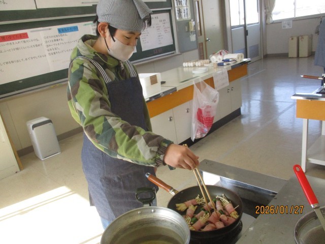 メニューは、野菜のベーコン巻きです!野菜をゆでたり、ベーコンを巻いたり、同じ班の友達と協力しながら調理することができました!!